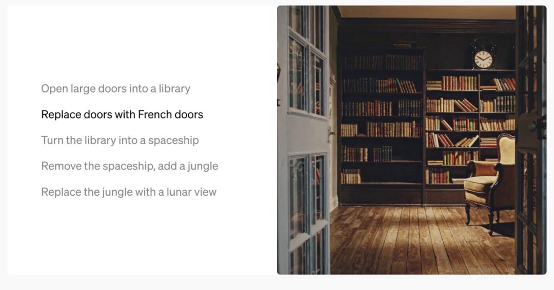这个功能不容易翻译。可能是AI才有的新工作,也就是你可以改变视频中的一个元素。比如Sora可以先生成“推开图书馆大门”,然后把大门改成法国风格,把图书馆改成太空飞船,把推开门的场景改成热带丛林,或者把热带丛林改成月夜美景——同时大门的风格和视频的其他部分是一致的。