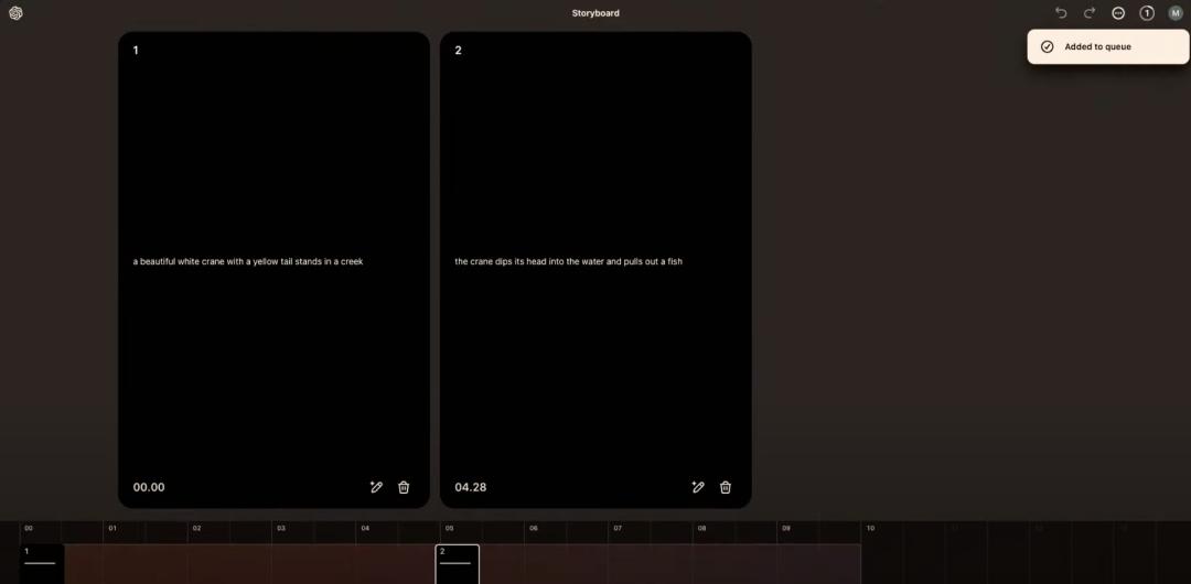以视频为例,研究人员将上述白鹤的视频切下来,导入故事板进行切割,给视频的前后留下了继续创作的空隙,换句话说,可以有一个新的开头和结尾。