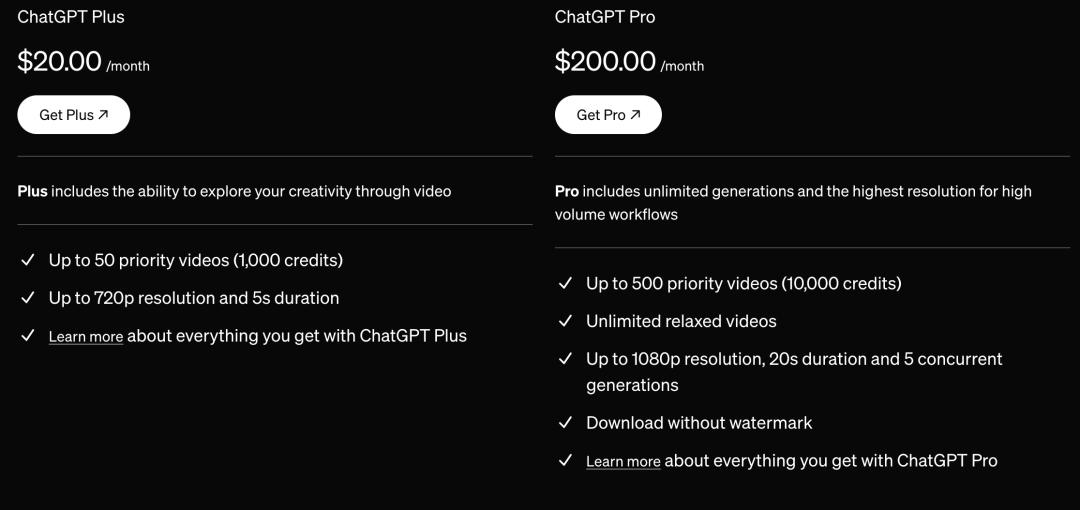与文字相比,视频的推理成本似乎更高,但是这一次, OpenAI 没有单独的目标 Sora 收费。20 美金/月的 ChatGPT Plus 会员、以及 200 美金/月的 ChatGPT Pro 所有成员,都可以使用 Sora。