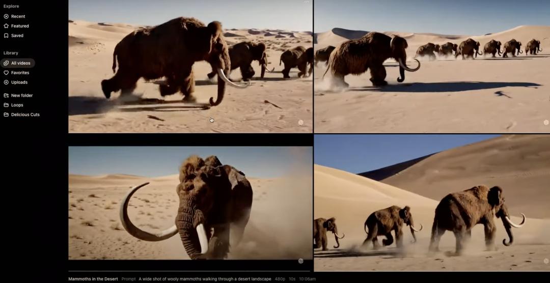 例如,Sam Altman 首先给予文字输入,「长毛猛犸象在沙漠中行走,广角镜头拍摄」。然后,需要选择场景比例、分辨率、时间(5-20) 秒)、并且最终产生的视频数量(最多可以产生四个段落进行选择)等等,可以得到产生的视频。