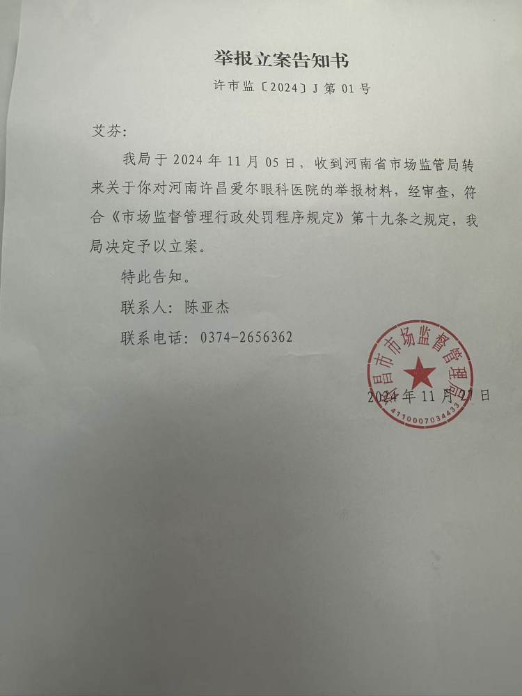 许昌市市场监督管理局有关负责人表示,已要求许昌爱尔眼科医院提供时限材料,案件正在调查中。