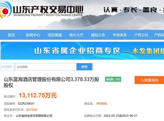 去年,山东蓝海酒店管理有限公司3378.33万股股份在山东产权交易中心上市,蓝海股份有限公司最核心的酒店板块。出让方为山东财资管理有限公司,出让底价13112.75万元,出让日期为5月25日至6月2日。