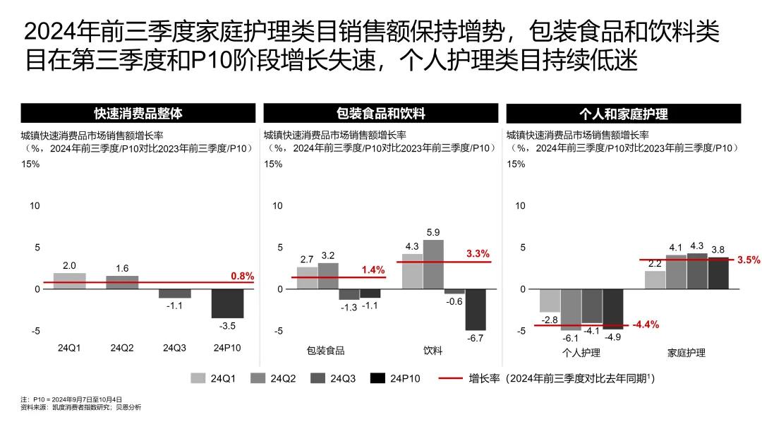 家庭护理在四大快消品领域中,以家庭护理为主。 3.5% 销售增长率领先市场,饮料类别以饮料为主 3.3% 随之而来的是包装食品类别的小幅增长, 1.4% 。个人护理类别下降 4.4% ,相对于2023年前三季度的下跌,有所扩大,接近2022年的下跌水平。