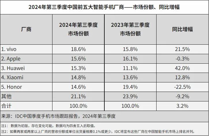 相比之下,对OPPO“失势”的描述,国际数据公司(IDC)发出的危险信号更为明显。IDC报告显示,2024年第三季度,中国智能手机市场出货量约为6878万台,vivo以近19%的出货量排名第一,苹果以15.6%的市场份额排名第二,华为、小米、荣耀排名前五,而OPPO(含一加)则跌出前五,沦为“others"(其他)。