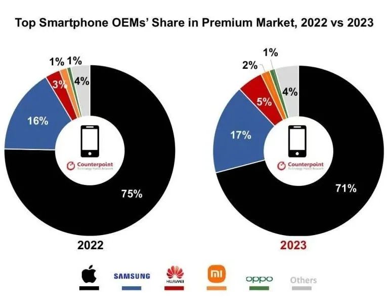 当前,全球高端手机行业几乎被苹果和三星两大巨头所垄断。根据Counterpoint的数据,苹果和三星的总份额在2022年和2023年超过600美元的全球高端手机市场中超过85%,而OPPO的市场份额一直保持在1%左右。