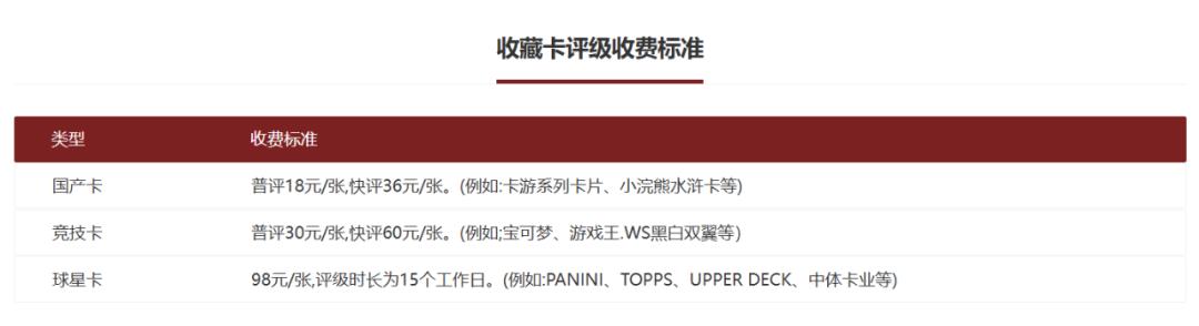 在卡牌评级的资费标准方面,不同的评级机构会根据卡牌的类型、价值和评分时间逐步收费。一般来说,PSA等海外评级机构、BGS等分数在卡圈中的认可度较高,但由于需要海外运输,成本和时间成本相对较高。国内评级机构的评级成本相对较低。一般一张国产卡的评级成本只有15-23元左右,评级时效比海外机构快很多。但是由于国内很多评级机构成立时间短,评分结果在玩家中的认可度并不是很高。
