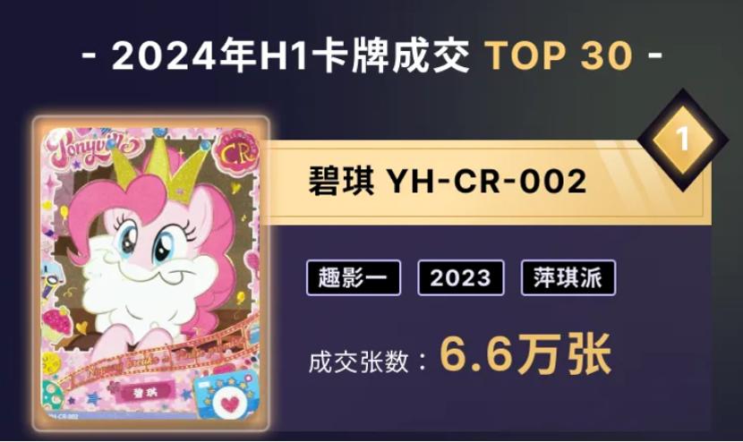 据二手交易平台千岛官方账号公布的交易数据显示,截至2024年8月19日,该平台今年最受欢迎的前五大IP是小马宝莉、叶罗丽、火影忍者、著名侦探柯南和第五人格。在2024年H1卡交易TOP30榜单上,前30名都被小马宝莉称霸,其中蓝琪卡交易数量达到6.6万张。