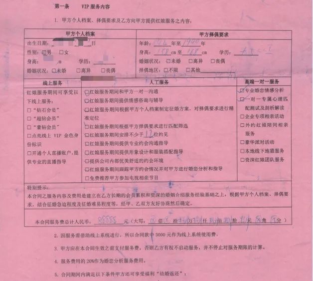 魏先生说,2019年,由于婚姻和爱情的需要,他在上海世纪佳缘网站注册了会员。此后,嘉园平台分配的一对一“媒人”打电话给他,推出优惠活动,让会员免费找对象,让他支付8888元并签订合同。他说:“对方当时说这项服务有退款优惠,就当存款了,还口头承诺一年之内一定能帮我找到目标。”他说,于是他付费注册,成为世纪佳缘VIP会员。