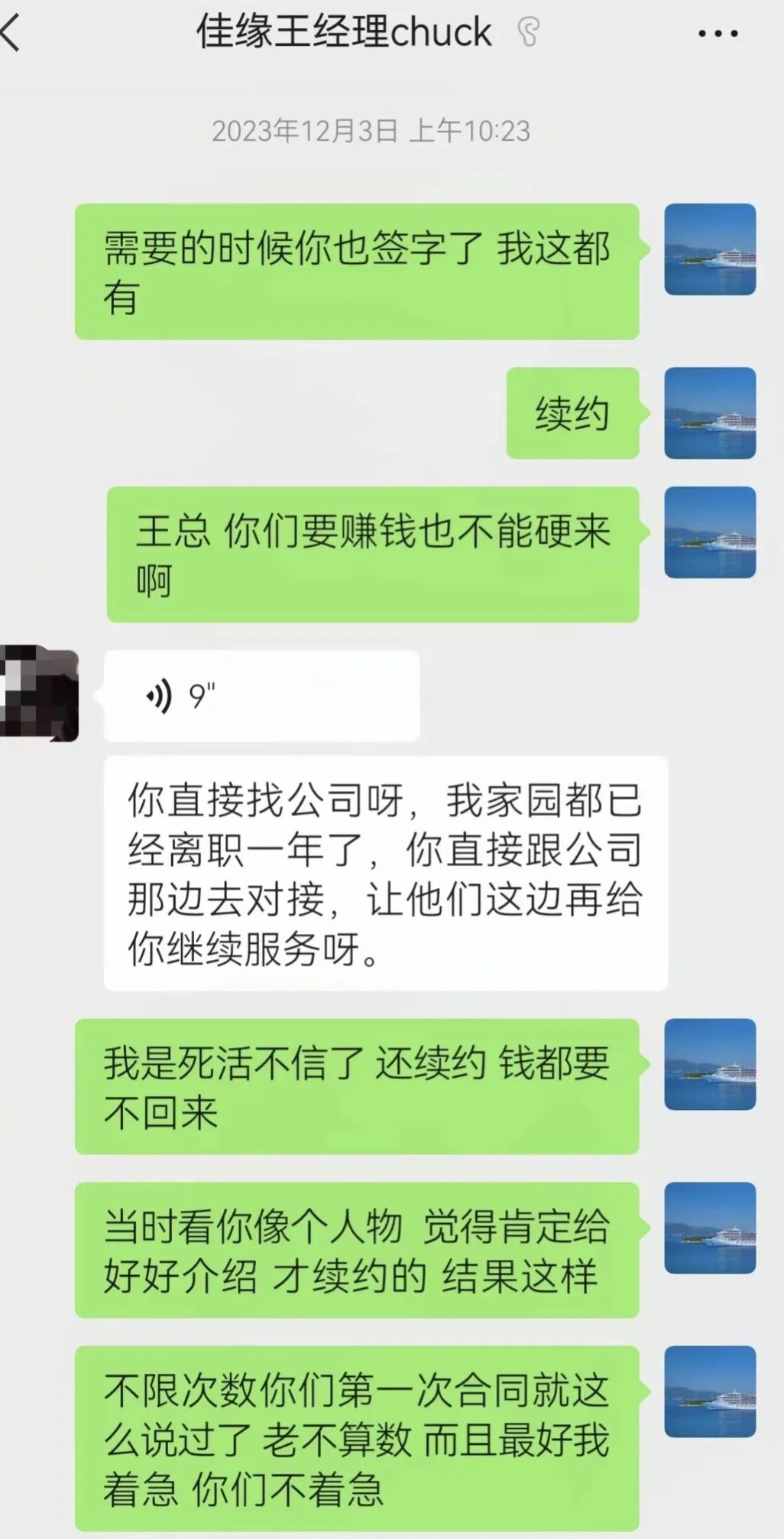魏先生说,当他遇到12个相亲对象时,离合同规定的服务期还有几个月,但平台不再介绍新人,所以他试图申请退款。“他们让另一个销售经理王告诉我,他们会努力提高服务,让我再续费一次,否则之前的费用无法退还。”魏先生说,2021年1月,他再次支付了8888元,但他仍然没有成功相亲。