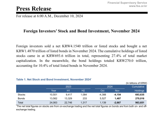 根据韩国金融监督院发布的《11月外国证券投资趋势》,上个月外国投资者在韩国股市净卖出4.154万亿韩元,持续4个月净卖出韩国股票。与此同时,外国投资者购买了1.48万亿韩元(约75亿元人民币)的债券。