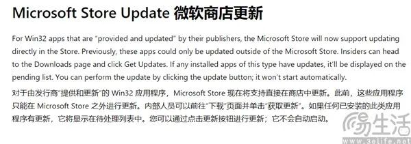 据微软在官方博客上透露的信息显示,Win32应用程序由发布者提供和更新,Microsoft Store将支持直接更新。预览版客户可以下载网页,点击获取更新。如果任何安装的软件都有更新,Microsoft Store将显示更新细节,用户只需点击更新按钮即可执行,但是该功能不会自动更新。