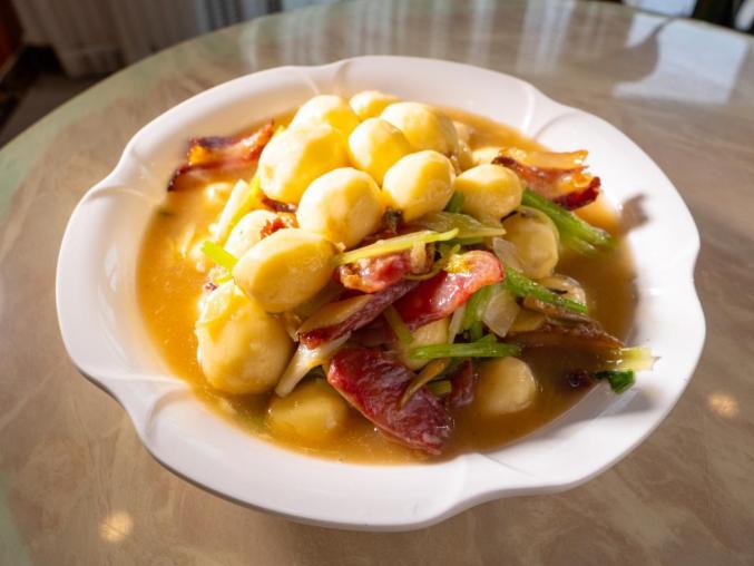 面条以面粉为主要原料,面粉加水打开,揉成面团,然后擀成一大片半透明的薄面,再放在干燥的地方晾干。薄薄的面条像雪白的旗帜一样在风中飞舞,所以有人称之为“旗面”,意思是祝福旗胜利。它的面片晶莹剔透,薄如蝉翼,入口顺滑,风味独特。
