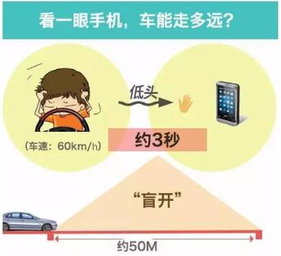 以玩手机为例,如果车速为60km//h,开车时看手机大约需要3秒钟,车辆给出大约50m的距离,这50m几乎等于盲驾。