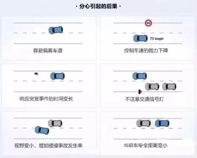 司机在分心驾驶时,无法观察周围的驾驶情况和道路环境,视野和注意力无法完全集中,在紧急情况下会削弱反应和适应能力,甚至会因为恐慌而误以油门为刹车。