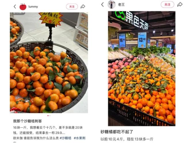 其中,沃尔玛的糖橙价格为每盒9.99元(一盒)≥盒马鲜生砂糖橙600克(约10.47元/500克),盒马鲜生砂糖橙19.9元/950克。另外,永辉超市最早在12月9日开始配送砂糖橙,也卖到了32.9元/1500克(约11元/500克)。