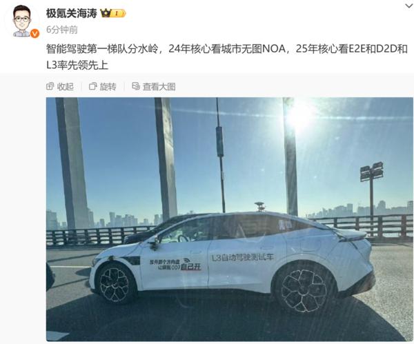 关海涛写道:“智能驾驶第一梯队分界点,24 年度核心看城市无图 NOA,25 年核心看 E2E 和 D2D 和 L3 率先领先。“另外,它还发布了一张正在检测的极氪。 007 测试车的照片,车上写着 L3 汽车自动驾驶测试字眼。从关海涛的言论中可以猜测,极氪有可能是 2025 每年率先带来比较 L3 自动驾驶等级功能。