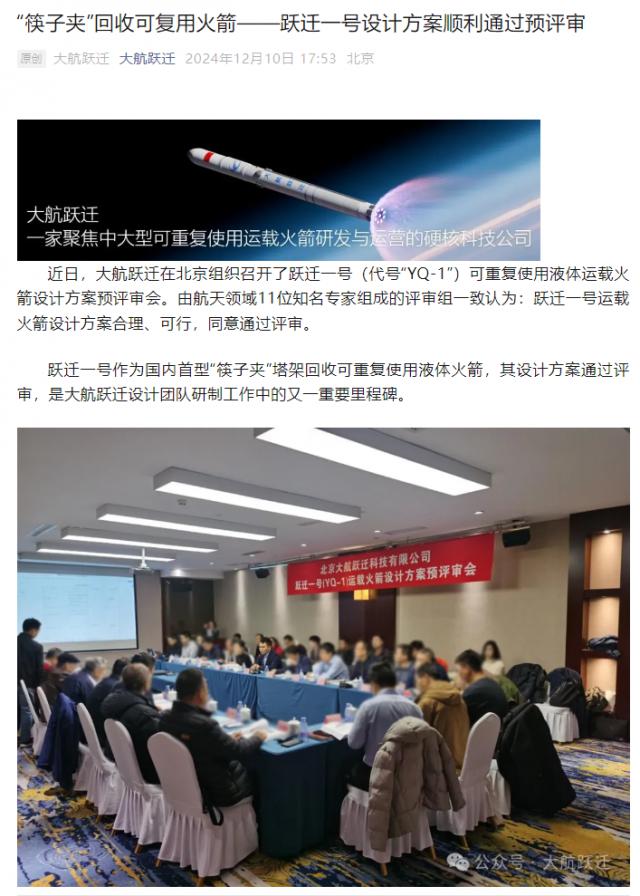 大航跃迁表示,跃迁一号作为中国第一个“筷子夹”塔的回收,可以重复使用液体火箭,其设计方案已经通过评审,是大航跃迁设计部门发展的又一重要里程碑。