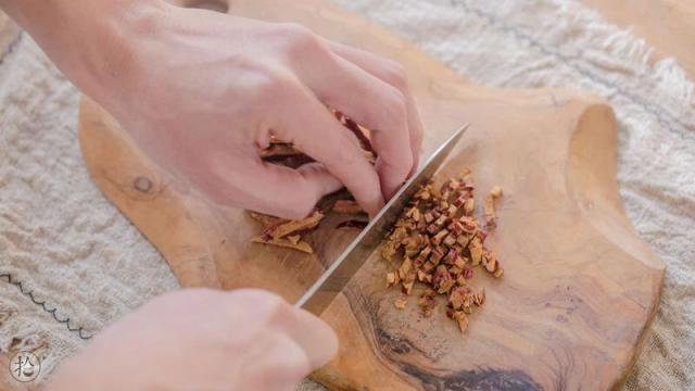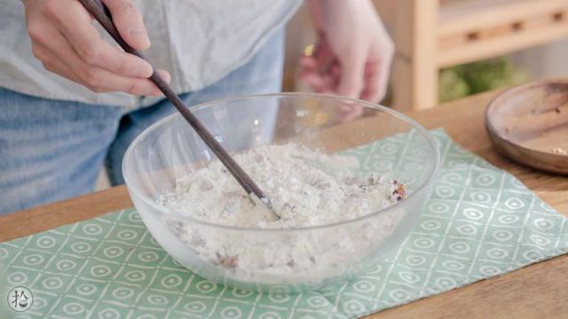 把 200g 将中筋面粉(普通面粉)与枣丁混合。