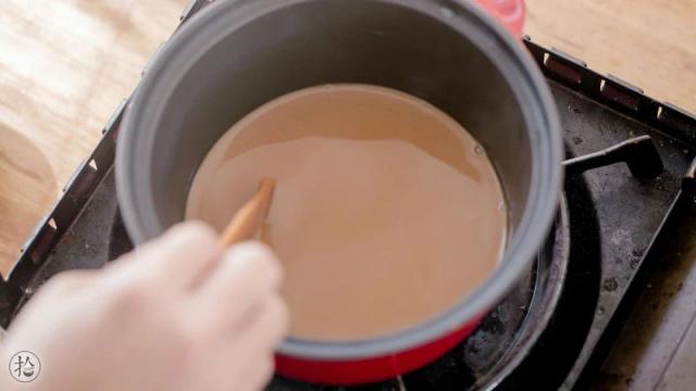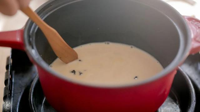 汤锅中倒入 110g 牛奶,把 30g 红糖拌入,