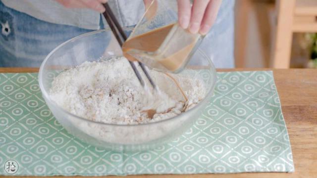 接着分批倒入面粉中,边倒入边将面粉搅拌成絮状,