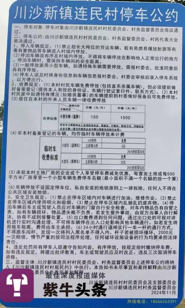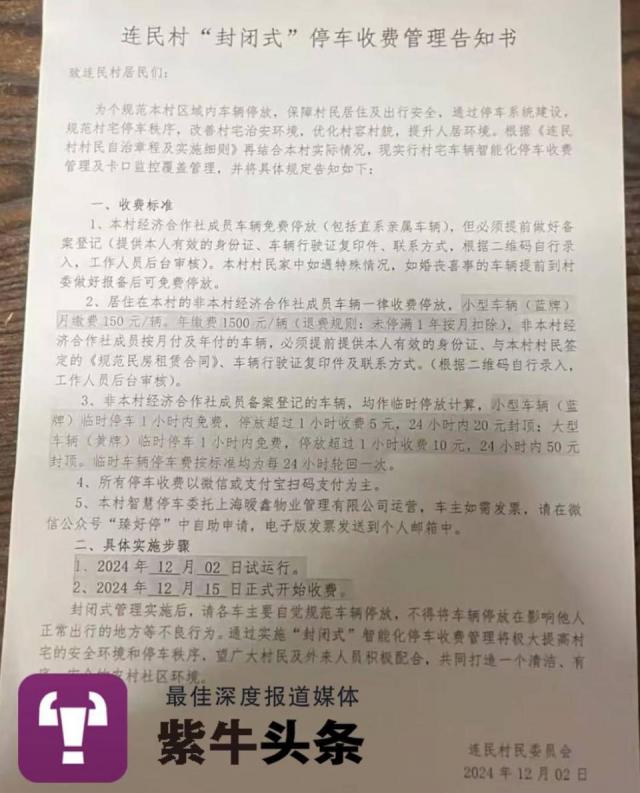 根据连民村“封闭式”停车收费管理通知书,该村经济合作社成员车辆免费停放(包括直系亲属车辆),但必须提前备案登记;所有生活在该村的非本村经济合作社成员的车辆都将收费停放,小型车辆(蓝色品牌)每月支付 150 元 / 辆,年交费 1500 元 / 辆。通知中还显示,“本村智慧停车委托上海嗝鑫物业管理有限公司运营”。