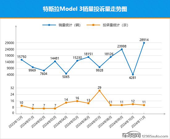 由于特斯拉超级工厂出货量下降,特斯拉 Model 3 在 10 月度销售跌至历史低点,当时不少自媒体声称自主品牌车型对其“围剿”初见成效。然而,他们也许没有想到“打脸”会来得这么快, 11 月特斯拉 Model 3 销售触底反弹,创下近一年的新高,回归汽车销售榜前 10 名。除了特斯拉拉之外,这当然是有原因的。 Model 3 产品实力仍在线外,推出长续航版车型,再次延期至延期。 12 月 31 日的 5 年度免息政策功不可没。特别是后者,经过四次延期,对增加销量有很大帮助。与销售大起大落相比,特斯拉 Model 3 除今年外,月度投诉表现始终保持稳定, 7 除了每月一次变动外,其它月份的投诉数量都比较少,短期口碑表现可圈可点。从其 11 月度投诉销售额比数值变化更大, 10 月份大幅下跌,现在已经降到个位,在榜单车型中排名第一,投诉销售额比业绩有了明显的提升。对于特斯拉 Model 3 现在看来,未来的市场走势是充满乐观的,但是销售能否走得更稳,还很难判断。