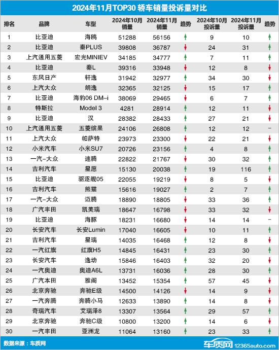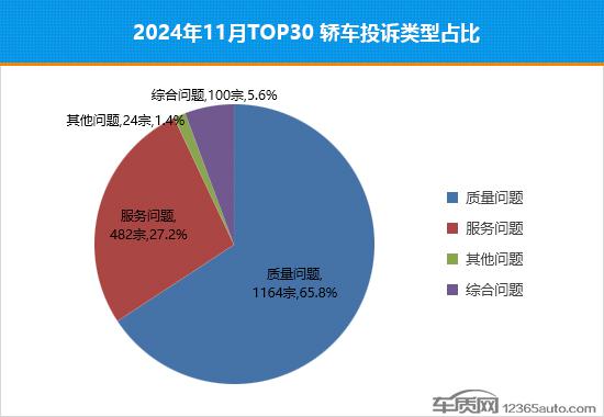 根据乘联会提供的全国汽车产销数据,2024 年 11 当月,国内汽车市场累计零售销售。 125.9 万台,连续第二个月突破百万辆价格,环比上涨。 同比增长21.9% 28.3%。与此同时,车质网受理车主对汽车的有效投诉 7,749 宗,环比下降 同比下降1.3% 8.1%。2024年,在清除投诉人自愿申请撤诉的信息后, 年 11 月 TOP30 汽车销售投诉数量排名如下: