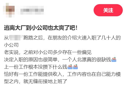 但今年,社交媒体上“逃离大厂,去小公司”的声音越来越多。有的大厂人跳槽去小公司后不适应,光速离职;也有人从大厂去了小公司如鱼得水。