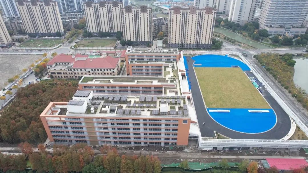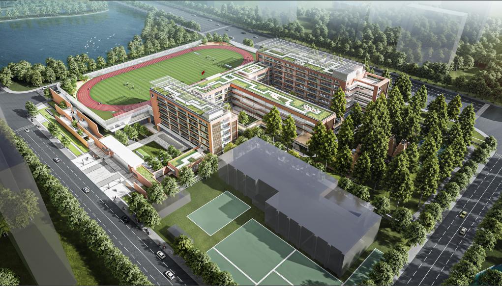 值得注意的是,学校标准化操场位于9米高空,位于楼层三楼,面积9200平方米。室内运动场位于操场下方。校长姚红贤介绍,学校规划建设用地内有一片水杉林。为了尽可能保留自然树木资源,新学校在建设设计之初,专门将操场设计提升,融入自然与人文共存的设计理念。学校的办学特色也与学校环境和文化建设紧密契合,确定了以“共生”为中心,构建师生共生、家校共生、人与自然共生、人与世界共生的和谐共生现代化学校。