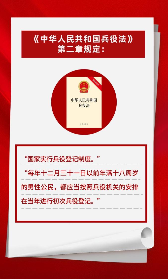 中国《兵役法》明确规定,国家实行兵役登记制度。12月31日前年满18岁的男性公民,应当按照有关规定履行兵役登记责任。18岁以上的男性可以登录全国征兵网,也可以登录部队媒体移动旗舰客户端“中国军号App”关注“参军登记”频道,点击“兵役登记”完成登记。已经进行兵役登记的,有参军意向的可以直接参加网上申请登记。