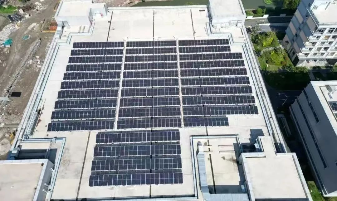 中来智联考虑到要尽量减少跨接,采用了光伏组件的区块化排列,既节省了DC电缆,又做到了整洁、美观。另外,项目适度缩短了部件间隔,在保证光伏电站基本发电效率的同时,也方便企业多样化地利用屋顶空间。以混凝土墩为光伏支架基础,在其上安装光伏板,可以有效保护现有的混凝土屋顶,避免新建光伏阵列可能造成的屋顶漏水,同时降低屋顶温度。