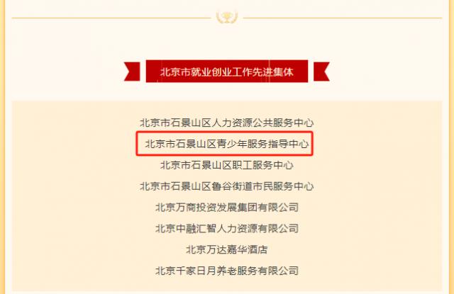 石景山区青年服务指导中心获北京市先进集体就业创业荣誉称号。