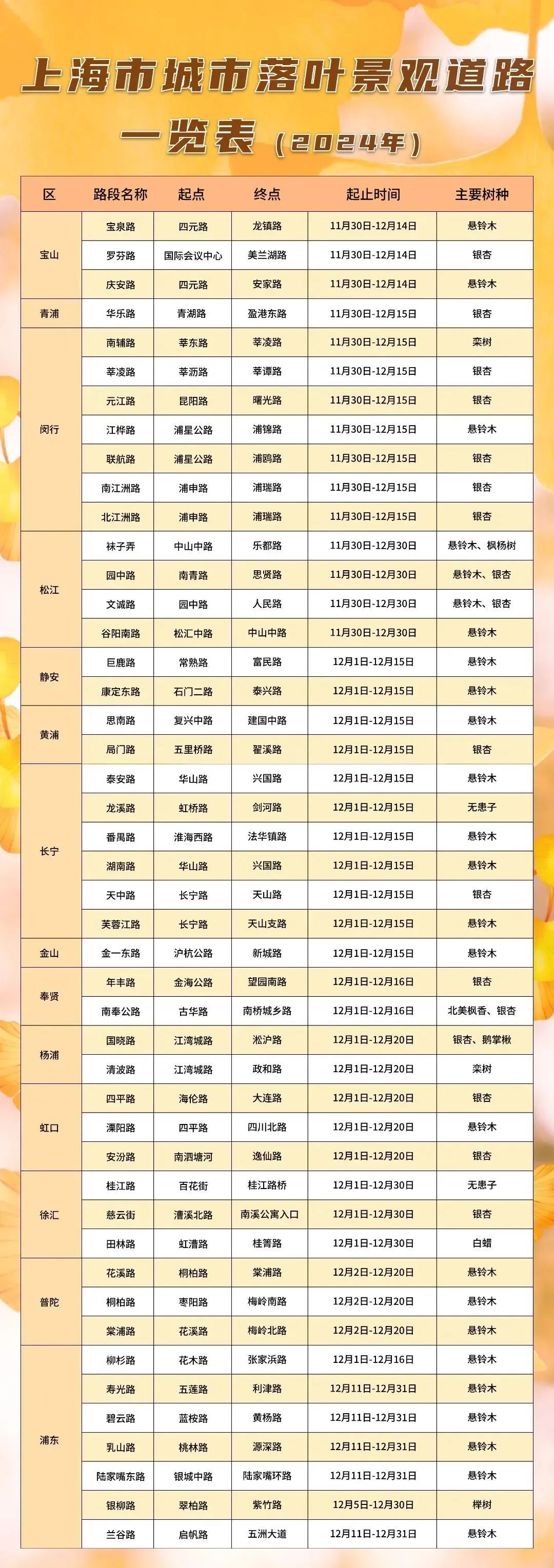 近日,市绿化市容局公布了全市46条“落叶不扫景观道”名单。又是一个枯叶季节,申城各地五彩缤纷的秋景将呈现给大家。今年,“落叶不扫”的景观道路相继启动,为广大市民提供了更好的秋景欣赏环境。