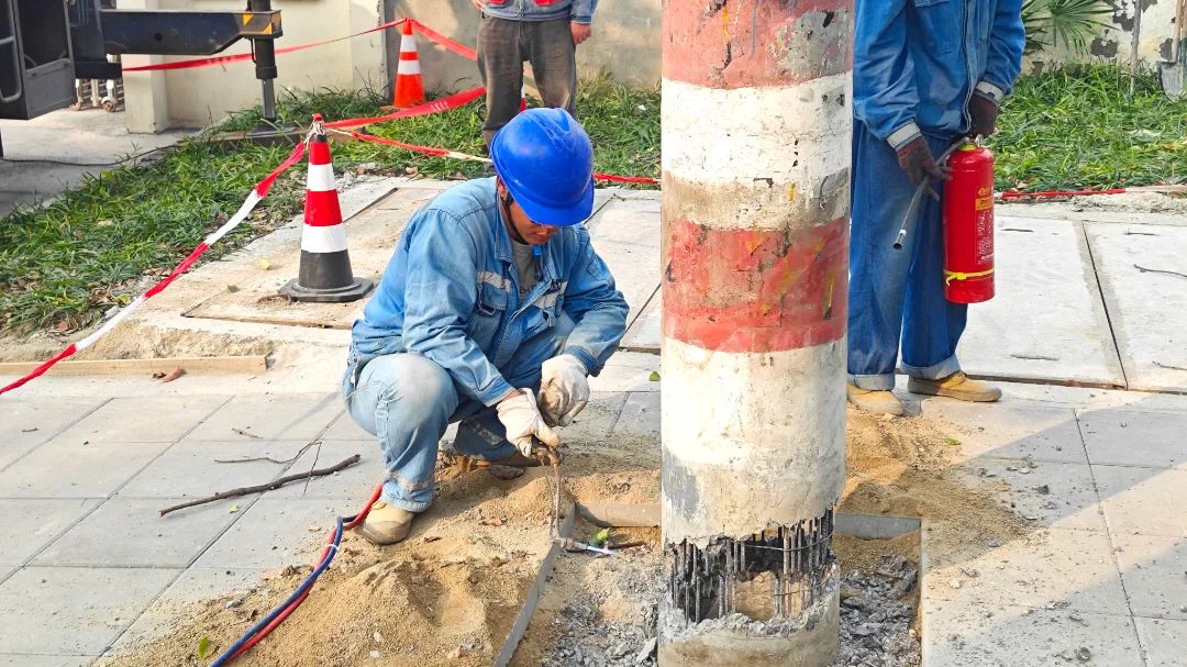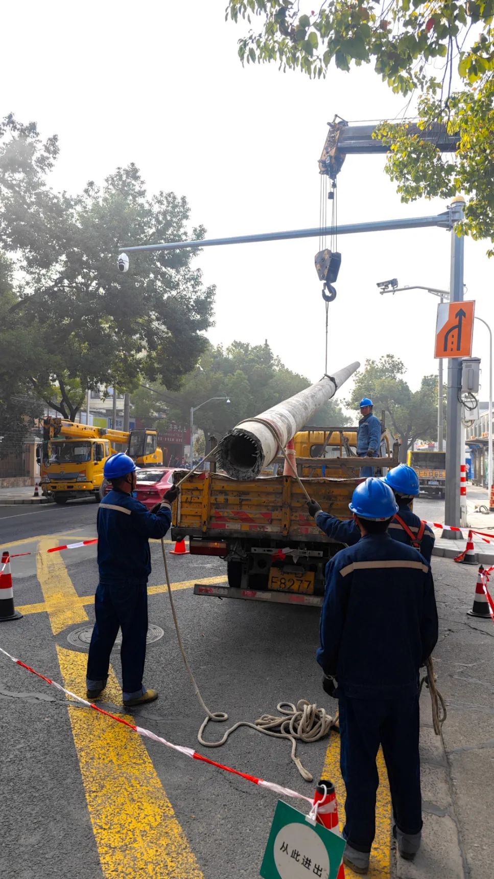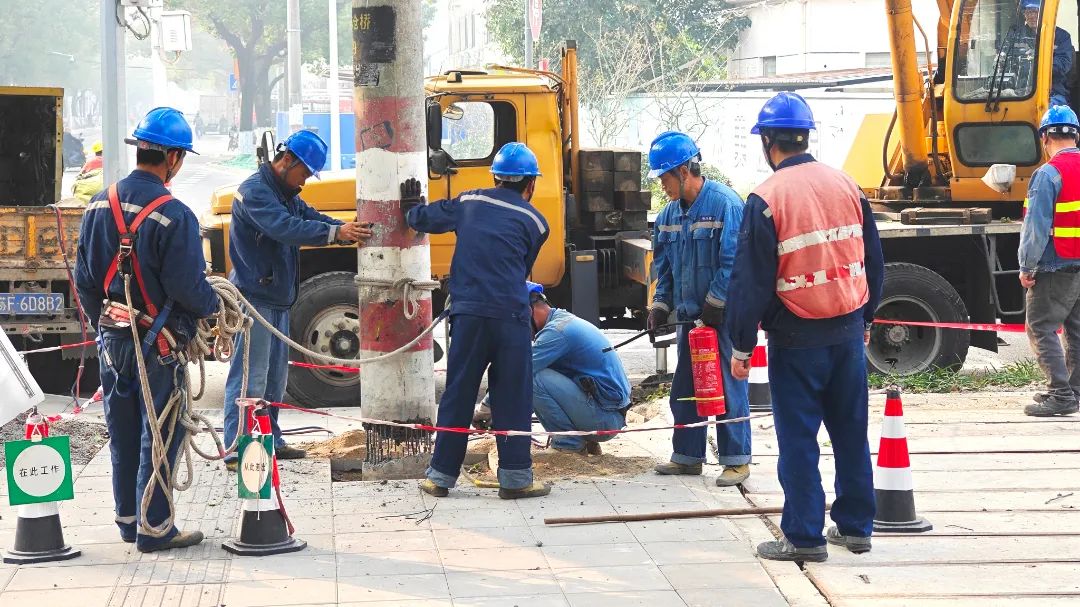 记者在青安路架空线入地的施工现场看到,大型起重机和运输车辆排列有序,施工人员正在紧张有序地拔掉电杆。看见工人们整齐地爬上电杆,拆下上面的电器设备和电缆,然后用绳子牢牢地固定电杆。接着吊车稳稳地吊起服务多年的水泥电杆,工人们在底部认真工作,用焊接切割固定钢筋。由于被拔掉的电杆依次装运出去,曾经头上复杂的电线消失了,天空突然变得宽阔起来。