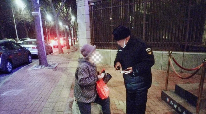 室外温度低,担心老人坐在石墩上感冒。孟宪辉把老人带到有取暖设备的保安亭,搬到椅背上的椅子上,让她坐下休息,把老人的情况反映到他工作的小区物业,希望能有更多的方式帮助老人回家。