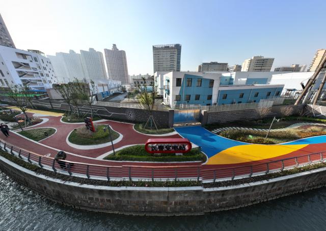 为使生态治理成果真正造福社区居民,田林街道结合" 15 “分钟社区生活圈”的建设理念,打造多功能滨水空间,将千鹤党群服务中心 · 沿河步道设置邻里汇。这个多功能中心不仅提供体育、社区食堂等服务,还引入了基本的卫生和便捷的购物功能,真正为周边居民服务,提高生活质量。同时,街道沿河步道区设置了休闲观光区、海绵科普区、健康活力区等不同功能区,不仅为居民提供了多样化的活动场所,还通过宣传标志和景观设施向居民推广了生态环保理念,使这条河流成为集休闲、教育、健身于一体的综合性公共空间。