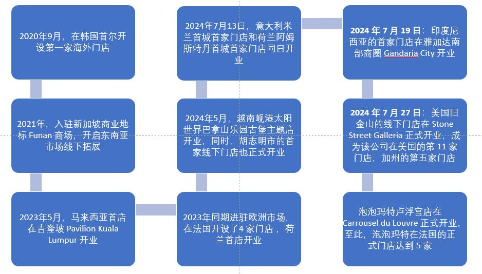 泡泡玛特从第一家海外店落地(20年9月韩国首尔)到2022年,中间因为疫情耽误了海外店,但到2024年,两年内已经全面爆发。
