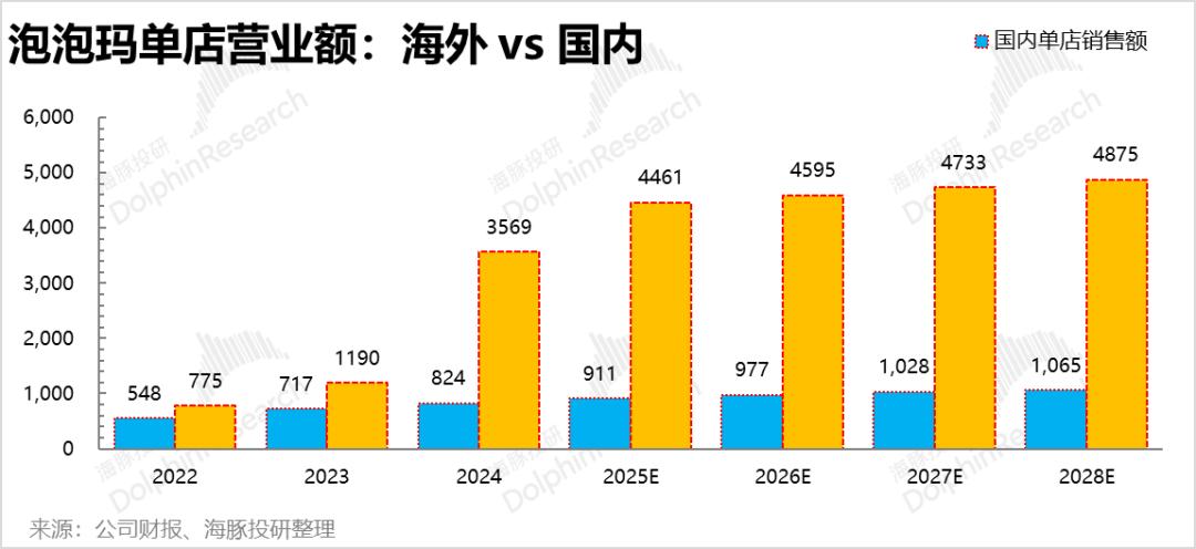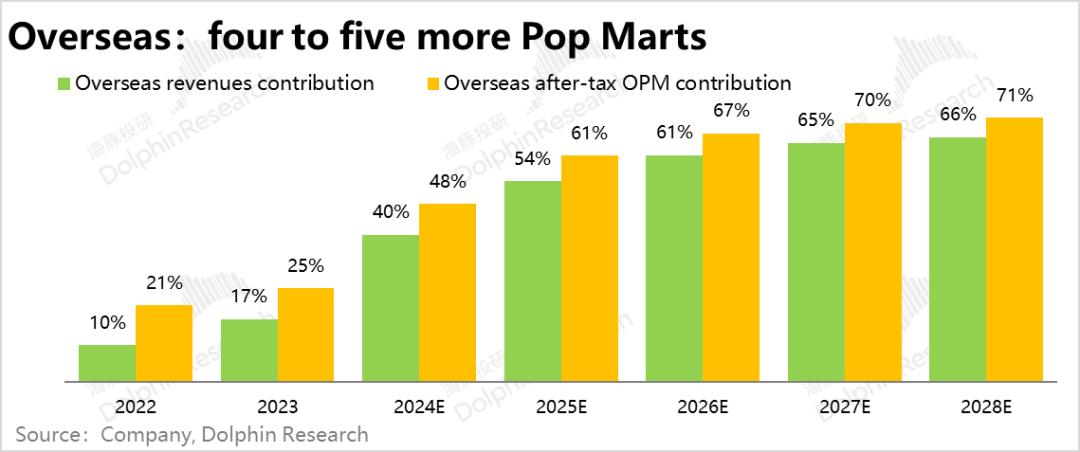 但在单店营业额方面,今年下半年门店营业额2500万元(月总营业额400多万元)与门店铺数量不足有关。在这种情况下,海豚君假设2025年单店营业额实际上比今年下半年下降了10%左右,未来单店营业额每年只增加3%,门店销售额略低于乐高(年门店收入4900元 vs 5600),即增长仅靠开店驱动,店铺销售额不会带动增长(与国内店铺稳定相比,店铺年销售额仍能保持稳定增长5%以上,这与产品的品类生命周期有关)。对于海外市场的总体假设属于中性偏传统。