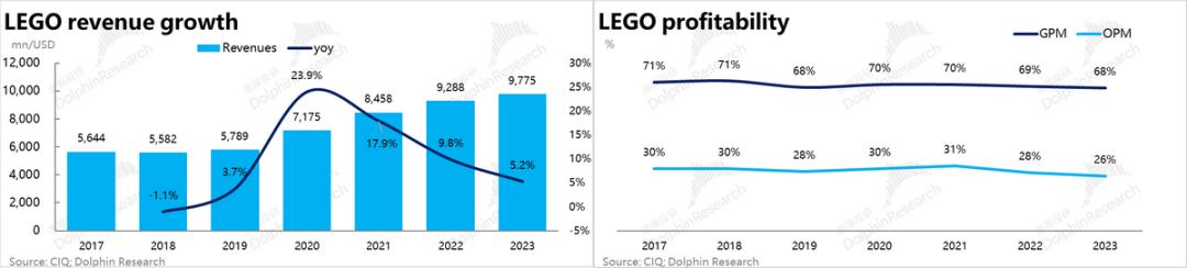 在全球比较中,我们选择了丹麦玩具公司乐高,也是通过店面(只是加盟分享)推广的。两者都属于时尚玩法,主要运营模式是线下零售店。毛利率&净利率与泡泡玛特相似,约60%和20%,公司完全成熟。