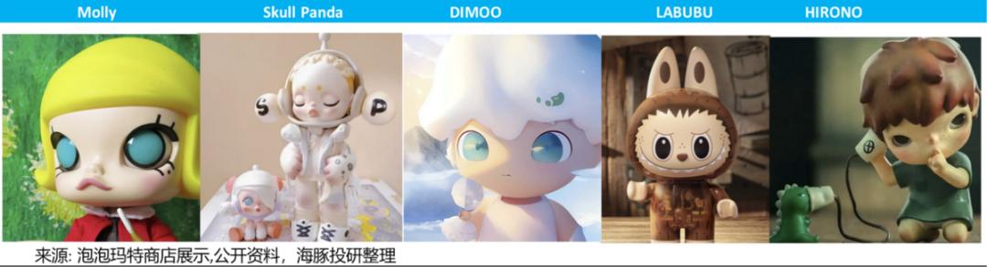 另一方面,我们来看看目前流行的几款头部IP。——Molly、SKULL Panda、Labubu、DIMOO和 HIRONO(小野),在基本元素上,看不到明显的国色。