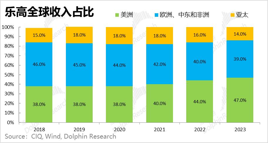 从丹麦本身来看,营收结构完全是一家彻头彻尾的国际公司;以美洲给它的基本市场,如果其他地区作为海外市场,乐高和非美洲已经达到了53%,仍然是一家国际化水平非常高的公司。