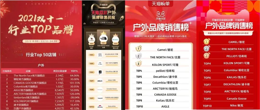 2021-2024年天猫双十一户外榜TOP10 来源:天猫
