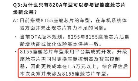根据官方解释,小鹏众筹换芯不支持8155升级到8295,一个重要原因是同时更换驾驶舱控制器和智能驾驶控制器,升级成本比820A升级8295高出1万元。