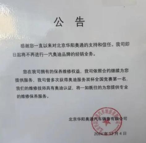 近日,华阳奥通汽车销售有限公司是北京最大的奥迪店之一,也是奥迪在华“顶流”的经销商,决定停止一汽奥迪品牌的配送业务。