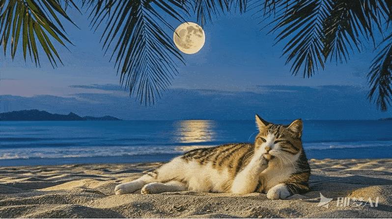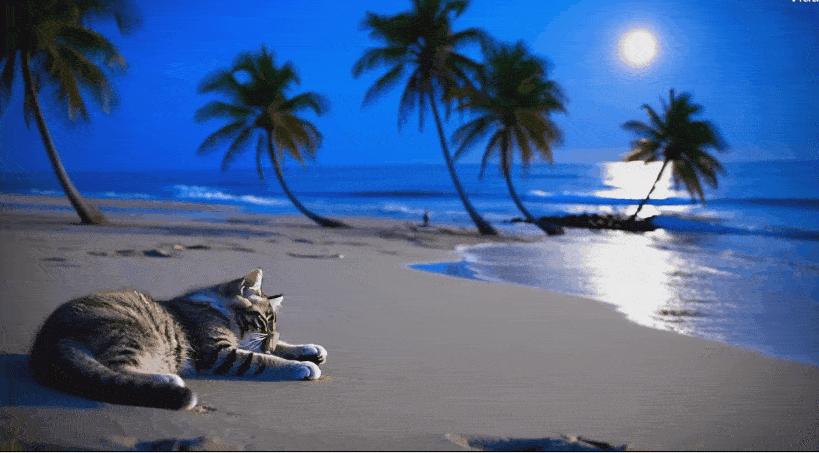 小雷生成了一段描述语“宁静的沙滩,满月高高地挂在天空,微风吹着海边的椰子树,传来哗啦啦的声音,一只小猫懒洋洋地躺在沙滩上,舔着前腿上的头发”的视频。具体结果如下:无论是舔头发还是风吹椰子树,细节丰富程度都很高。唯一明显的漏洞可能是产生的结果是白天,而不是小雷描述的夜晚。