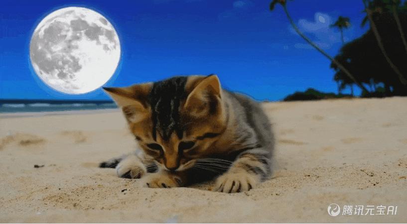 目前腾讯混合元视频模型只支持文化视频,每天可免费生成4个标准质量和2个高质量视频。小雷还用腾讯混合元模型生成了一个视频。太大的月亮造成了虚假的感觉,猫舔头发的动作充满了不服从。椰子树距离太远,细节不够丰富。