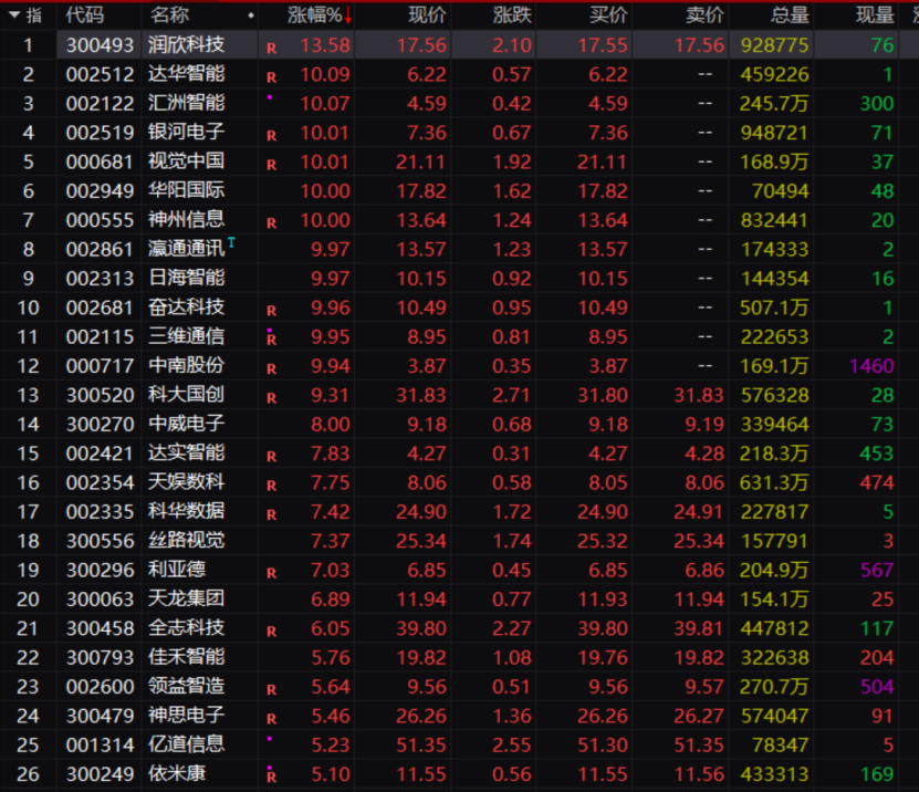 今天上午,市场的主线仍然围绕着人工智能和机器人。机器人概念股反复活跃,巨轮智能、宁波精达、科力尔、柯力传感达到新高。在人工智能方面,日线涨停再次出现,润欣科技、达华智能、视觉中国、科大国创等股票大幅上涨。从事件来看,驱动力也非常明显。