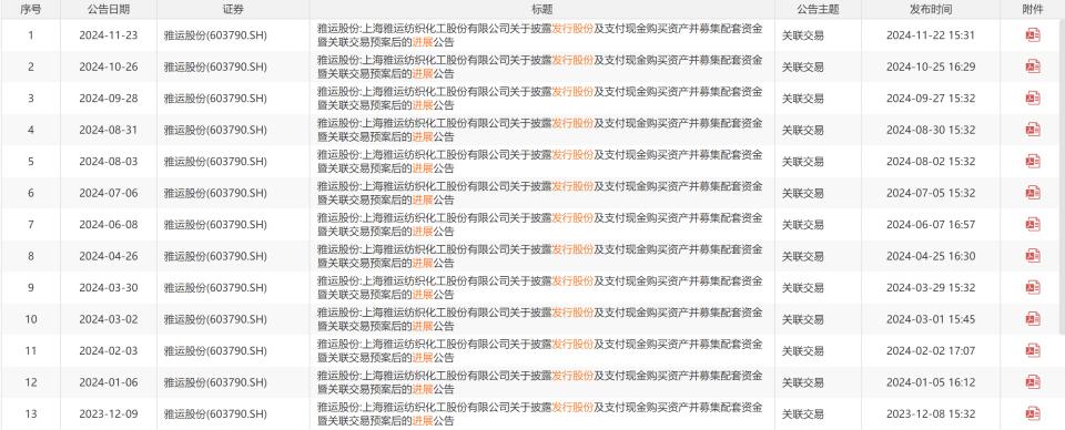 在回复询证函的同一天,雅运股份发布了重大资产重组计划(修订稿)。2023年11月10日,雅运股份修订了第二次重组计划,此后连续披露了十余份交易进展公告,但内容均为“公司及相关各方正在有序推进本次交易的相关工作”,没有实质性进展。