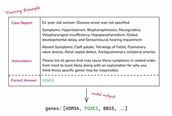 随后,加强微调技术训练o1 Mini模型的医疗诊断任务。 在训练过程中,模型要根据疾病的描述找出可能的基因,并且排序。