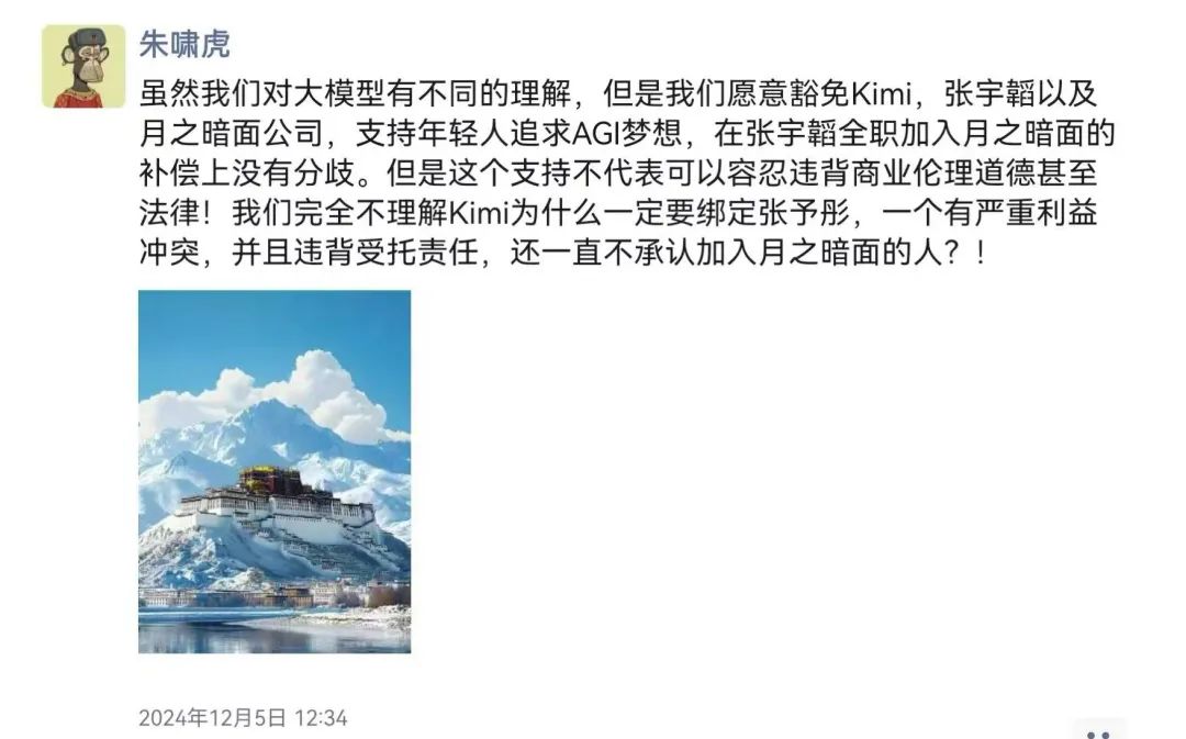 12月6日晚,在朱啸虎等老股东的压力下,杨植麟不得不出来,在社交媒体上发文回应澄清,同时也被解读为拒绝与张予彤进行切割的要求。